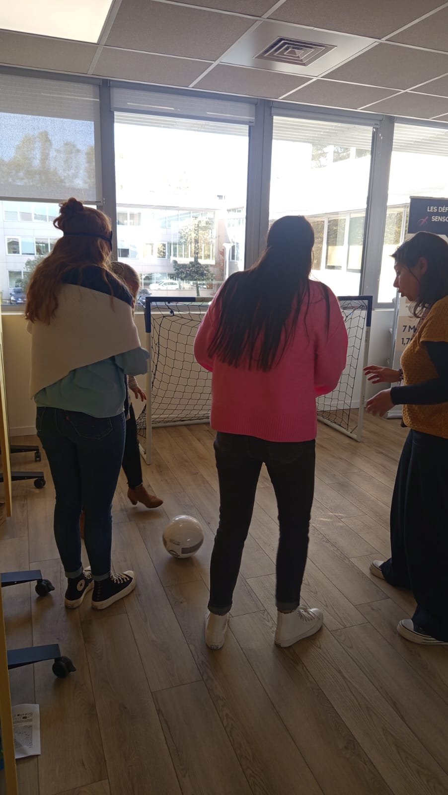 Nous installons des cages de foot, les participants, en binôme, masquent leur yeux et doivent gagner la partie, à l'aide d'un ballon sonore. Grâce à cet atelier, vous comprendrez les difficultés de déplacements et d'orientation dans l'espace que peuvent rencontrer des personnes en situation de handicap visuel.